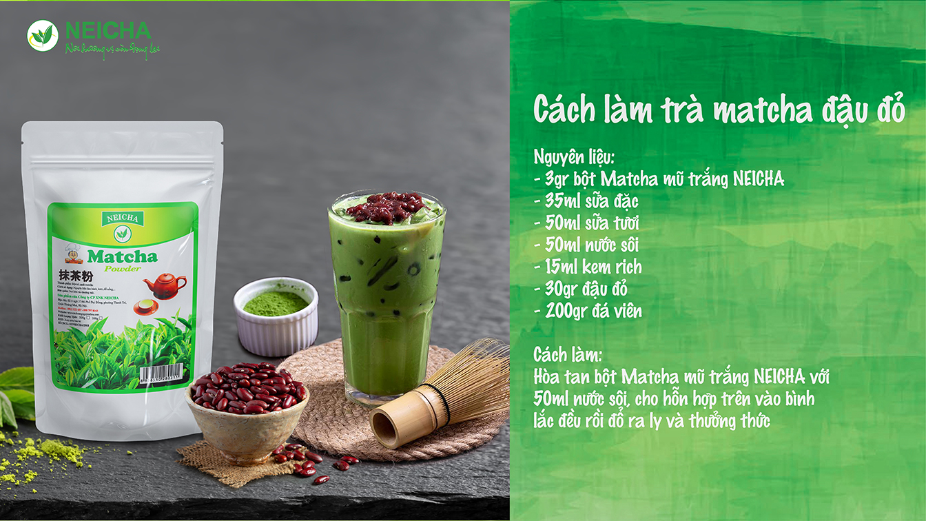 Sự kết hợp giữa vị đăng đắng của bột matcha Đài Loan Neicha cùng beo béo của sữa, thêm vị bùi bùi của đậu đỏ đã tạo nên sự kết hợp hoàn hảo, cho ra đời món “matcha đậu đỏ” vừa lạ vừa ngon và rất được lòng thực khách. Tham khảo ngay công thức dưới đây nhé.