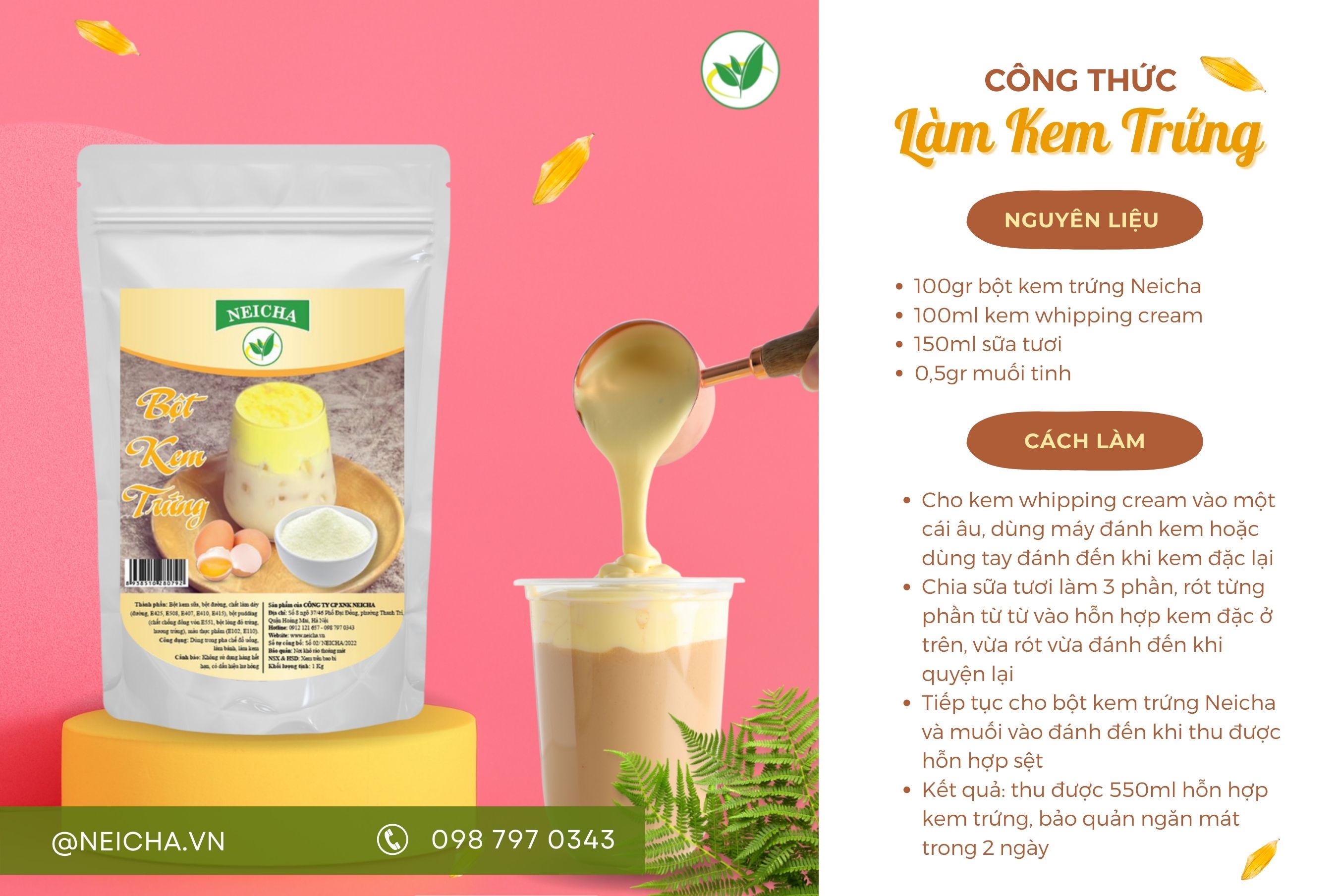 Sản phẩm bột kem trứng Neicha với định lượng đạt tỉ lệ chuẩn chỉnh, hương vị đảm bảo không lẫn tạp chất, vì thể sẽ tạo ra thành phẩm kem trứng mềm mịn, vị béo ngậy tự nhiên như kem trứng truyền thống. Cách làm kem trứng từ bột kem trứng siêu đơn giản, tham khảo bên dưới nhé.