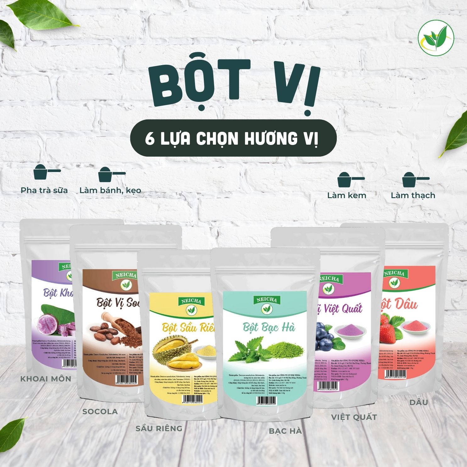 Mang hương vị đặc trưng của từng loại, bột vị Neicha sẽ giúp cốc đồ uống đậm vị và ngon hơn. Dựa trên nhu cầu của thị trường, Neicha cho ra mắt 6 loại bột vị được yêu thích hiện tại, bao gồm: bột vị socola, bột vị sầu riêng, bột vị khoai môn, bột vị việt quất, bột vị bạc hà, bột dâu.