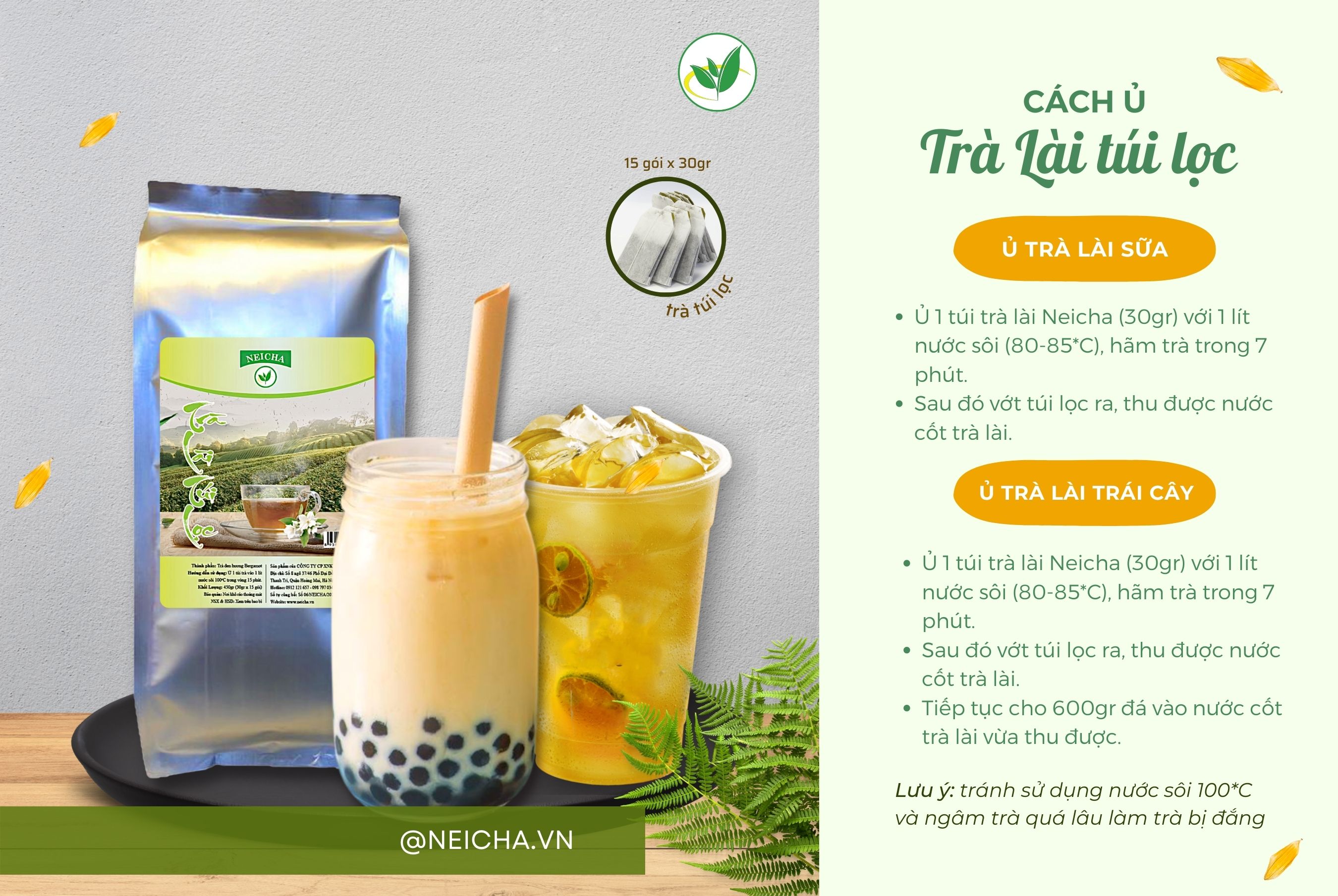 Tính tiện lợi của các loại trà túi lọc rất được yêu thích. Dù là tại cửa hàng đồ uống hay pha chế tại nhà, trà túi lọc chính là lựa chọn của nhiều người, dùng để pha trà sữa hay trà trái cây đều ngon mà không tốn quá nhiều thời gian. Trà lài túi lọc và hồng trà túi lọc là 2 trong số những loại cốt trà được ưa chuộng. Vậy bạn đã biết cách ủ trà túi lọc đúng cách chưa? Tham khảo cùng Neicha bên dưới nhé.