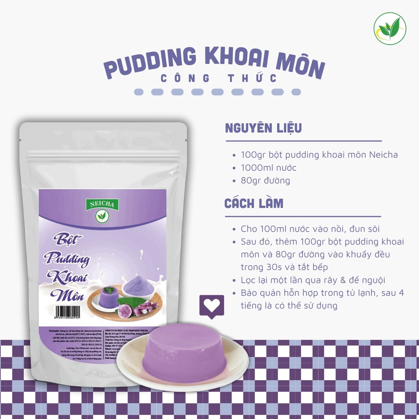 Chuẩn bị 3 nguyên liệu dễ kiếm: bột pudding khoai môn Neicha, đường và nước. Chưa tới 15 phút là bạn đã có một mẻ pudding khoai môn thơm ngon, hấp dẫn. Tham khảo và cùng bắt tay vào làm pudding khoai môn ngay hôm nay.
