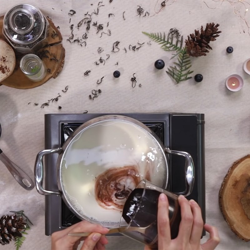 - Đun nóng 480ml sữa tươi không đường, 70gr đường xay và hỗn hợp cacao vừa làm xong rồi khuấy đều