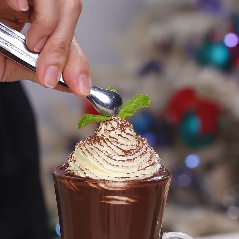 - Trang trí kem tươi phia trên cùng + 1 lớp bột cacao + 1 lá bạc hà