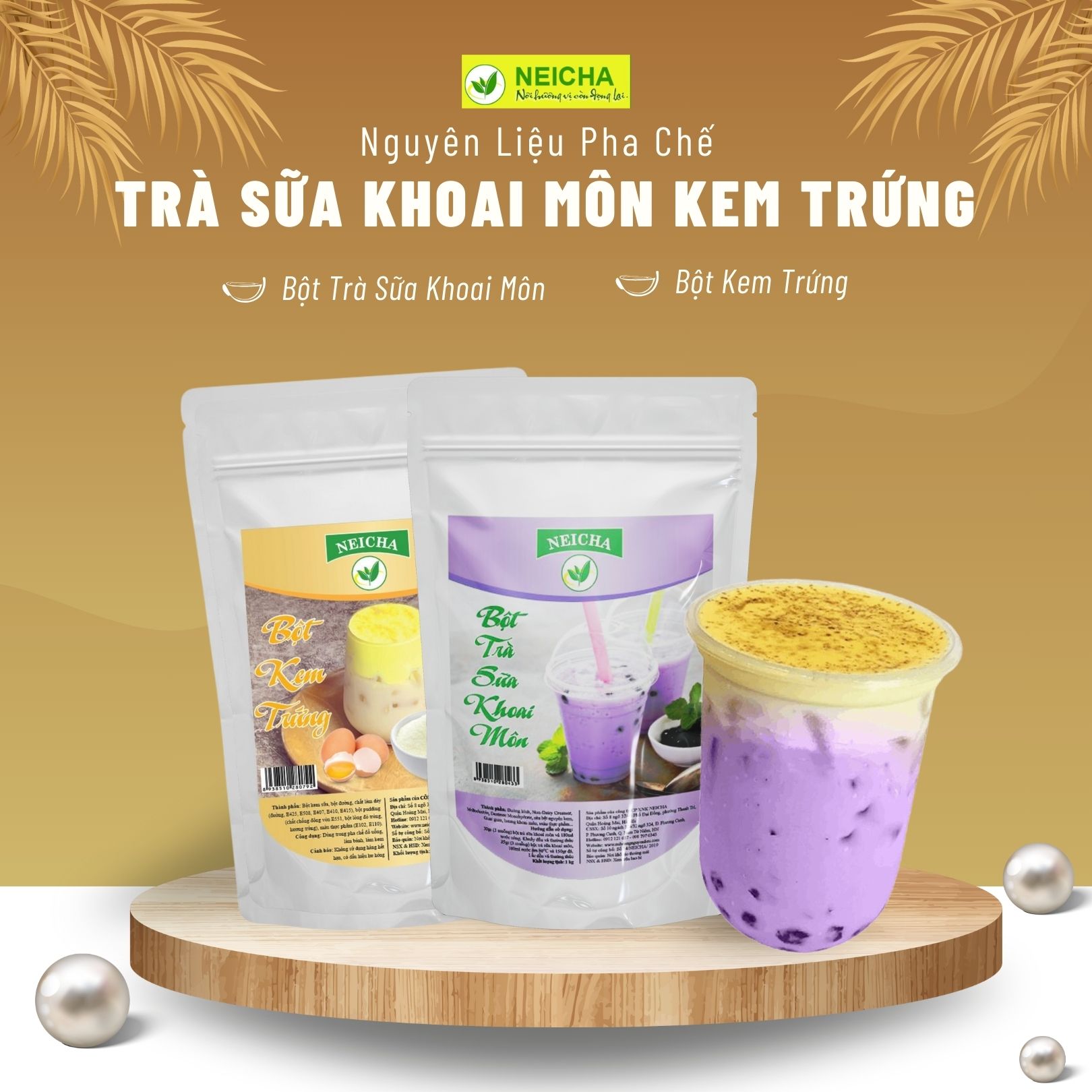 Neicha mang đến bạn hai nguyên liệu tiện lợi, thơm ngon và an toàn giúp bạn có thể an tâm thưởng thức những cốc trà sữa khoai môn kem trứng ngay tại nhà: bột trà sữa khoai môn và bột kem trứng, bạn đã có chưa?