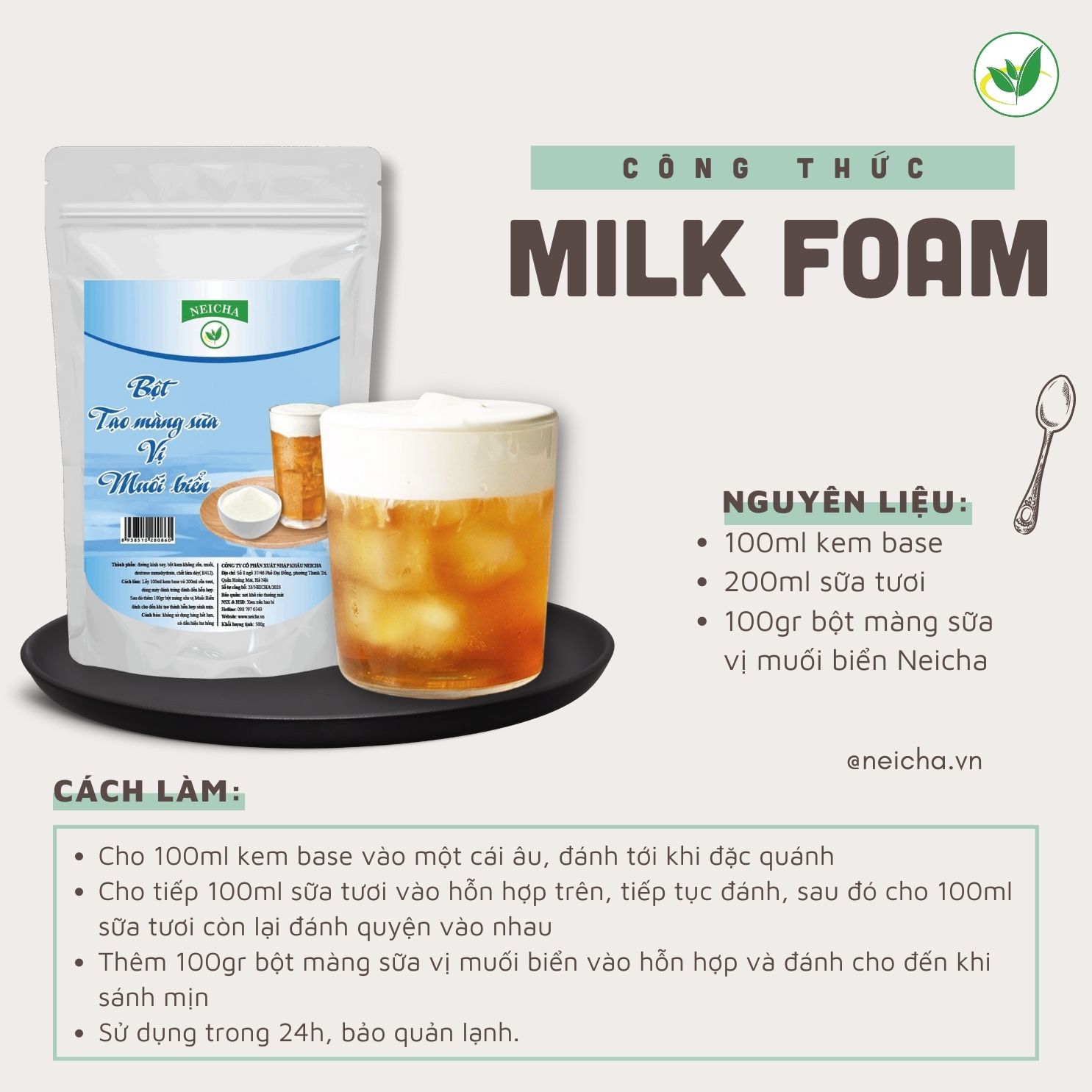 Milk foam là lớp kem có vị mằn mặn, beo béo, thường được phủ trên bề mặt các món đồ uống như: trà sữa, trà ô long,…Milk foam lạ miệng có tác dụng tăng thêm hương vị của thức uống và tạo cảm giác mới lạ nên nhanh chóng nhận được sự yêu thích của rất nhiều thực khách. Và trà sữa socola cũng không ngoại lệ. Neicha mách bạn công thức milk foam cực kì đơn giản, bạn cần chuẩn bị 3 nguyên liệu: bột màng sữa vị muối biển Neicha, kem base và sữa tươi. Tham khảo ngay cách làm ở dưới.