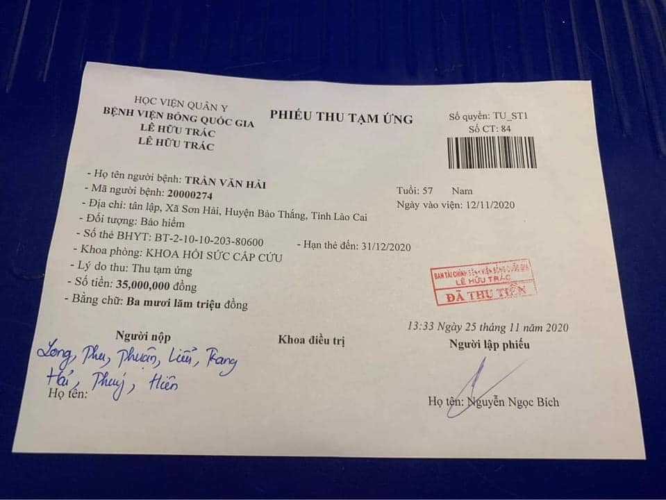 Hôm qua, ngày 25/11/2020 đoàn #Cầu_Nối_Thiện_Tâm thay mặt cho những tấm lòng thơm thảo, tới phòng 216, khoa hồi sức cấp cứu, #bệnh_viện #Bỏng_Quốc_Gia đóng viện phí và trao hỗ trợ cho chú Trần Văn Hải, sinh năm 1963, thôn Cánh Địa, xã Sơn Hải, huyện Bảo Thắng tỉnh Lào Cai: