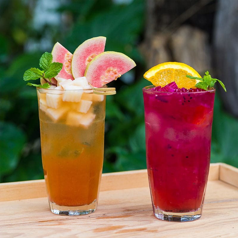 Bạn có thể trang trí thanh long đỏ cắt hạt lựu, đào tươi cắt lát và một nhánh bạc hà trên cùng để tạo điểm nhấn hoàn hảo và giúp cốc đồ uống ngon hơn, vừa uống vừa nhai cảm giác rất thú vị.