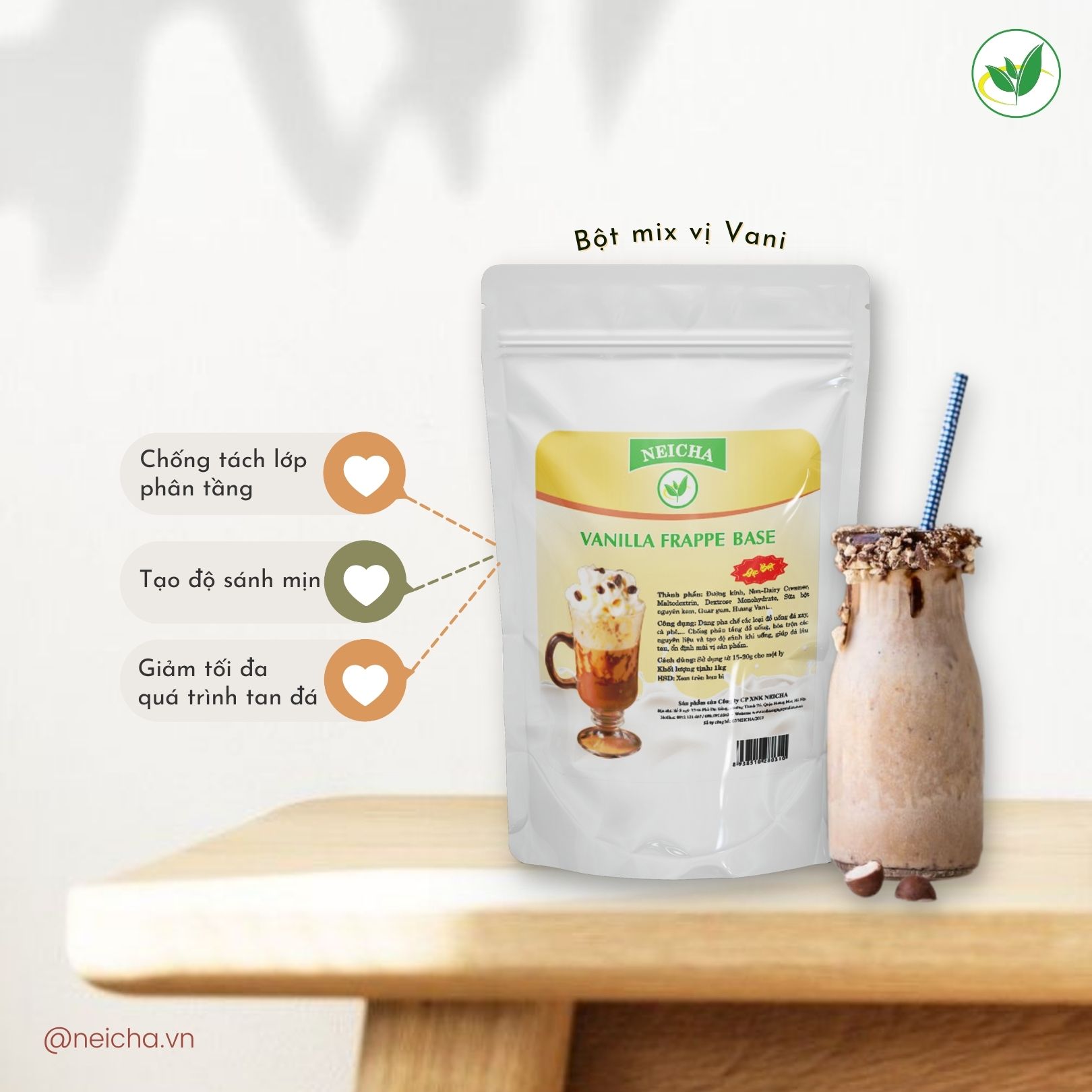 Nếu muốn tạo điểm nhấn bằng vị vani thơm lừng, ngoài các ưu điểm đặc trưng của bột mix tuyệt vời (chống tách lớp phân tầng, tạo độ sánh mịn, giảm tối đa quá trình tan đá) thì bột mix vị vani Neicha sẽ là nguyên liệu chuẩn chỉnh phù hợp với nhu cầu pha chế của bạn.