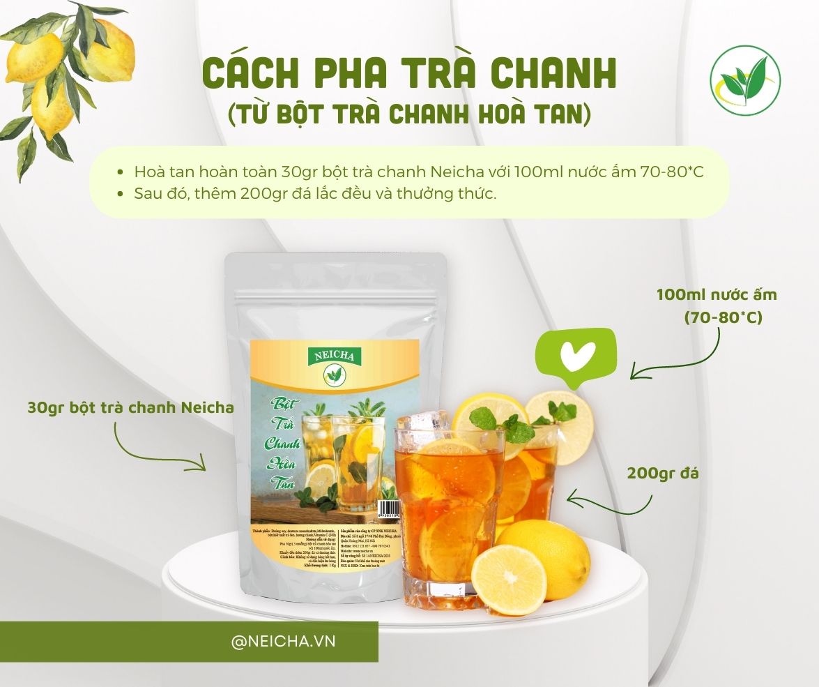 Bột trà hoà tan vị chanh đậm vị, tan nhanh, không vón cục pha trà chanh siêu nhanh chưa tới 10 phút. Bạn cần chuẩn bị 30gr bột trà chanh Neicha và 100ml nước ấm (70-80*C), khuấy đều và cho thêm 200gr đá là có thể thưởng thức. Bạn cũng có thể cho thêm topping xí muội, trân châu 3q,…để cốc trà chanh ngon hơn.