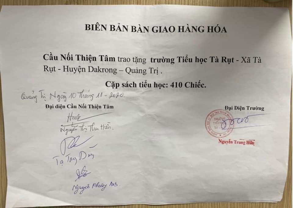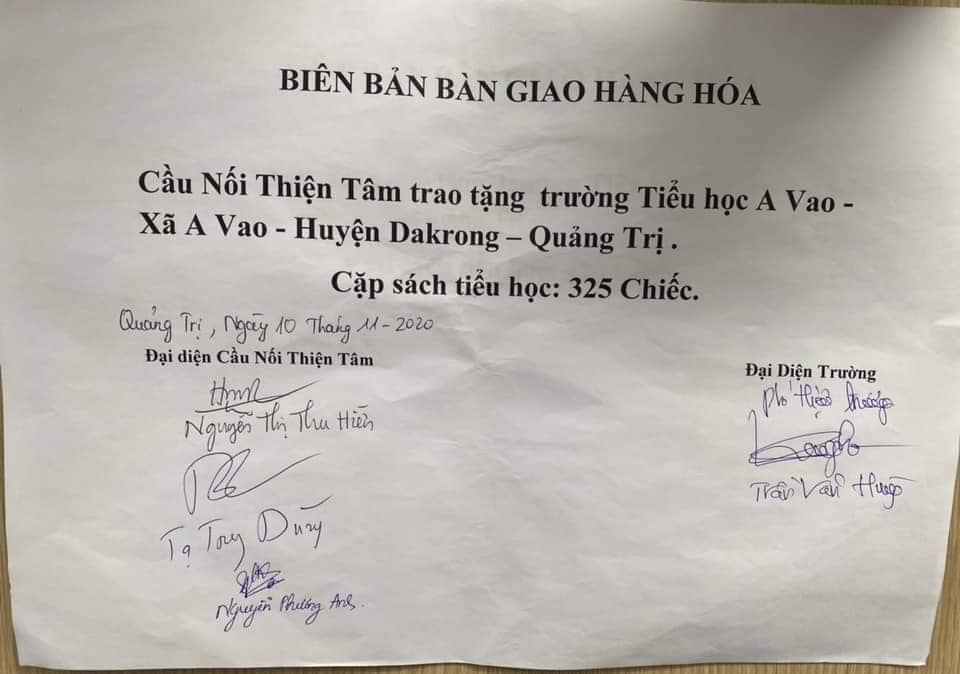 Ngày 9/11 /2020 Em Hằng cùng Đoàn đại diện cho các MTQ các nhà hảo tâm khởi hành đem rất nhiều tình yêu thương và quà dành cho các con học sinh của hai trường tiểu học Tarut và Avao thuộc huyên Đakrong tỉnh Quảng Trị . Hành Trang của đoàn mang theo trong đó có 735 chiếc cặp sách mà các thành viên CẦU NỐI THIỆN TÂM kết nối .